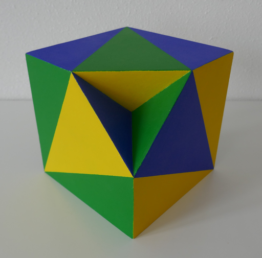 In totaal zijn er 33 kubussen die onderverdeeld zijn in 6 versies, t.w. 1 kubus in kubus (7x), 2 kleine driehoek in kubus (7x), 3 grote driehoek in kubud (7x), 4 staand met zijinkeping (6x), 5 liggend op paneel (3x), en 6 monokleur op paneel (3x). De kubussen zijn beschilderd met elk een verschillend patroon, meestal in drie verschillende kleuren. Zowel de voor- als achterkanten zijn beschilderd, uitgezonderd de versies 4 t/m 6. Doordat de kubussen driedimensionaal zijn, ontstaat er een verrassend beeld van een illusie. Als je goed naar de kubus kijkt, zie je op een gegeven moment dat de kleine kubus (of de kleine of grote driehoek} naar voren komt.