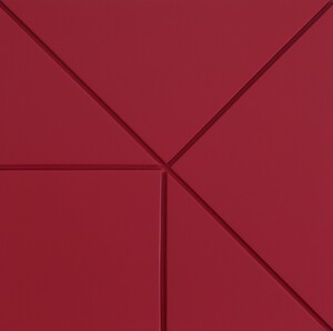2020De lijnen zijn gefreesd. Kleur: Rood, zijdeglans op waterbasis op 18 mm mdf. Afgewerkt met een aluminium lijst.