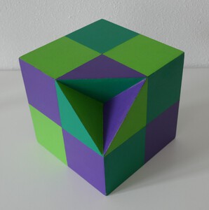 2021De kubus is 15 x 15 x 15 cm van 4 mm mdf. De uitsparing die naar binnen is 'geklapt', kan bestaan uit een vierkant, een kleine of grote driehoek. Doordat de vlakken van de gehele kubus in geometriche vormen geschilderd zijn, ontstaat er optische llusiie. Zowel de binnen- als buitenkant zijn geschilderd. De kubus kan op verschillende manieren uitgestald worden d.m.v. een bijgeleverde staander. Materiaal: mdf en acryl. Idee 1997 / uitvoering 2021. In totaal zijn er 33 kubussen gemaak.